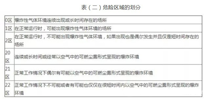 根據(jù)爆炸性環(huán)境的頻率和持續(xù)的時間把危險場所劃分為不同的區(qū)域。氣體場所劃分為三個區(qū)域:0區(qū),1區(qū)和2區(qū);粉塵場所分為三個區(qū)域:20區(qū),21區(qū)和22區(qū)。如表(二)所示: