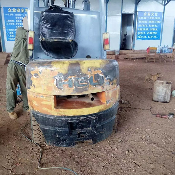 這臺翻新的叉車,可以肯定的說是假冒偽劣叉車,從圖中我們可以看到配重打磨過的痕跡,黑乎乎的,似乎已經(jīng)準備完工。