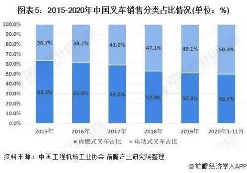 從2015-2020年中國叉車銷售分類占比情況來看,電動式叉車的銷量占比逐年提升,從2015年的36.7%提升至2020年1-11月份的50.3%。主要是受到環(huán)保政策及室內作業(yè)環(huán)境要求的驅動作用,電動叉車需求持續(xù)增長。另外,根據中國工程機械工業(yè)協會資料顯示,在發(fā)達國家的叉車銷售結構中電動叉車占比均超60%,未來我國電動叉車比例將持續(xù)提升。