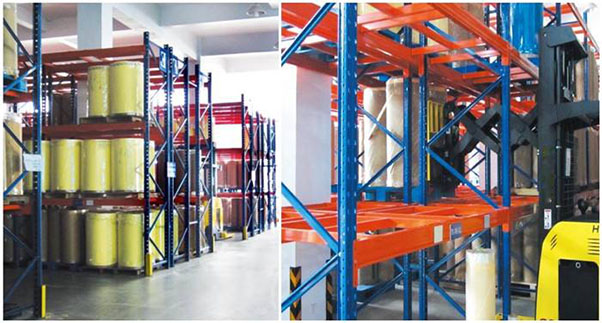 普通叉車(chē)搭配:一整棟式貨架,沒(méi)有專(zhuān)門(mén)的叉車(chē)通道,由叉車(chē)駛?cè)胴浖軆?nèi)部存取貨物。