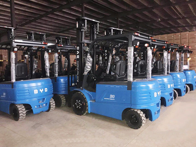 第一,比亞迪叉車為南昌基地提供近百臺平衡重式叉車;