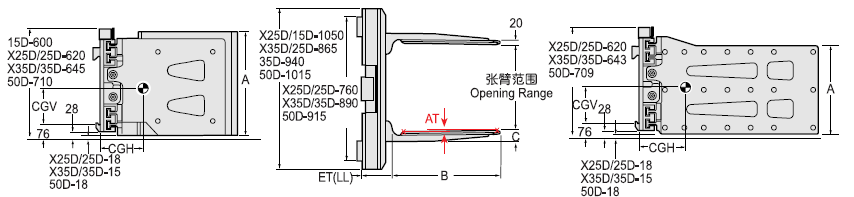 | Capacity 承載能力(kg) | Catalog Order NO 型號 | Mounting Class 安裝等級 | Opening Range張臂范圍(mm) | Rad Height夾板高度A(mm) | Arm Length臂長B(mm) | Arm Thickness臂厚C(見注5)(mm) | Arm Toe in內(nèi)扣量AT(見注6)(mm) | Vertcial Center Of Gravity垂直重心CGV(mm) | Weight 自重(kg) | Effective 失載距ET(mm) | Horizontal Center of Gravity 水平重心CGH(mm) |
